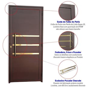 Portas de Abrir de Alumínio, Linha Super 25, Pintura Eletrostática Corten, 1 Folha de Abrir para o Lado Direito, Lambris Horizontais, 3 Frisos Polidos, Dourados e Envernizados, Puxador Londres 60 Cm Polido Dourado, Altura 210 Cm, Largura 80 Cm, Requadro 4,6 Cm, Garantia de 5 anos contra defeitos de fabricação. Ambientes Recomendados: Externo Acompanha Batedor: Sim Acompanha Batente: Sim Acompanha Fechadura: Sim Acompanha Guarnição: Não Acompanha Manual de Instalação: Sim Acompanha Trinco: Não Altura: 210 Ambiente Principal: Sala de Estar Cor: Marrom Corten Dourado Cor do Batente: Marrom Cor do Produto: Marrom Corten Dourado Escala de Brilho: Fosco Espessura: 4.6 Isolamento Acústico: Não Itens Inclusos: 1 Porta completa montada com Fechadura, Dobradiças e embalagem protetora. Acompanha Puxador Lado de abertura: Direita Largura: 80 Largura do Batente: 4.6 Linha ou Coleção: Super 25 Manual de Montagem e Instalação: https://product-hub-prd.madeiramadeira.com.br/869676/documents/b4fb33b8-92f7-44cc-b48c-7995ad5955e517manualesquadriasaluminio.pdf Material da Dobradiça: Alumínio Material do Batente: Alumínio Material do Puxador: Alumínio Necessita Montagem: Não Origem do Produto: Nacional Peso: 23.55 Possui Grade: Não Tamanho: 210cm x 80cm Tipo de Dobradiça: Simples Tipo de Parede: Alvenaria Tipo de Porta: Abrir Tipo de Puxador: Externo Vidro incluso: Não