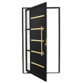 Porta Pivotante de Alumínio, Linha Super 25, Pintura Eletrostática Preta, 1 Folha de Abrir para o Lado Direito, Vidros inferiores Lisos Incolores 5mm Temperados, Lambris Horizontais e 5 Frisos Escovados, Dourados e Envernizados, Puxador Milão 80 Cm Escovado Dourado, Altura 210 Cm, Largura 100 Cm, Requadro 4,6 Cm, Garantia de 5 anos contra defeitos de fabricação.