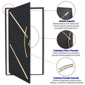 Apresentamos Porta Pivotante de Alumínio da Linha Super 25, com uma distinta pintura eletrostática na cor preta. Esta porta é composta por uma única folha que abre para o lado direito, oferecendo um design elegante e funcional. Os lambris dispostos em diagonal, juntamente com dois frisos diagonais polidos, dourados e envernizados, adicionam um toque de sofisticação à porta. O puxador Athenas de 80 cm, polido e dourado, complementa perfeitamente o design da porta, conferindo-lhe um aspecto harmonioso. Com uma altura de 210 cm e uma largura de 120 cm, e um requadro de 4,6 cm, esta porta é uma opção robusta e imponente para a sua entrada. Para a sua tranquilidade, oferecemos uma garantia de 5 anos contra defeitos de fabricação, garantindo a sua satisfação com o nosso produto. Ambientes Recomendados: Externo Acabamento do Puxador: Polido Acompanha Batedor: Sim Acompanha Batente: Sim Acompanha Fechadura: Sim Acompanha Guarnição: Não Acompanha Manual de Instalação: Sim Acompanha Trinco: Não Altura: 210 cm codigo_ean: 7898721693921 Cor: Preto Dourado Cor do Batente: Preto Cor do Produto: Preto Dourado Escala de Brilho: Fosco Espessura: 4,6 cm Isolamento Acústico: Não Itens Inclusos: 1 Porta completa montada com Fechadura, Batente Pivot devidamente embalada. Acompanha Puxador Lado de abertura: Direita Largura: 120 cm Largura do Batente: 4,6 cm Linha ou Coleção: Super 25 Manual de Montagem e Instalação: https://product-hub-prd.madeiramadeira.com.br/869553/documents/6d646b15-e0ba-4627-a896-a4dfbfd8f32d47manualesquadriasaluminio.pdf Material da Dobradiça: Alumínio Material do Batente: Alumínio Material do Puxador: Aço Material Principal: Alumínio Necessita Montagem: Não Origem do Produto: Nacional Peso: 35 kg Possui Grade: Não Tamanho: 210cm x 120cm Textura da Porta: Frisada Tipo de Dobradiça: Pivotante Tipo de Parede: Alvenaria Tipo de Porta: Pivotante Tipo de Puxador: Externo Vidro incluso: Não