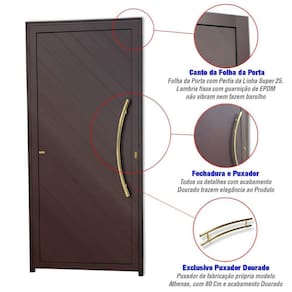 Apresentamos a Porta Pivotante da Linha Super 25, confeccionada em alumínio e com acabamento em Pintura Eletrostática Corten. Esta porta possui uma única folha que se abre para o lado direito, e é adornada com lambris dispostos em um padrão diagonal. O puxador Athenas, com 80 cm de comprimento, possui um polimento dourado que adiciona um toque de elegância. As dimensões da porta são de 210 cm de altura e 120 cm de largura, com um requadro de 4,6 cm. Além disso, oferecemos uma garantia de 5 anos contra defeitos de fabricação, assegurando a qualidade e durabilidade do produto.