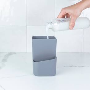 O dispenser possui válvula dosadora que permite dosagem do detergente gerando economia, e compartimento para esponja que é fechado, ou seja, o produto vai da pia direto para a gaveta ou armário sem escorrer água.