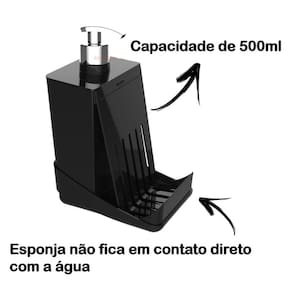 Garantia: 90 dias / Peso: 226g / Cor predominante: preto / Referência: 403074003; Dimensões: 19,2cm (C) x 13cm (L) x 10,2cm (A); Capacidade: 500ml e 1 esponja de louça; Conteúdo: 1 porta detergente e esponja; Material: poliestireno.