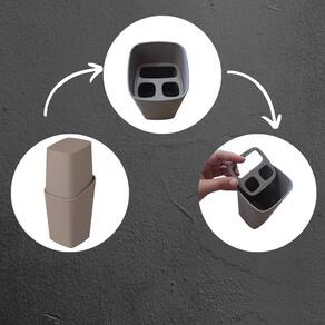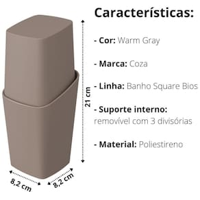 É fabricado em material de altíssima qualidade e super resistente. Com um design moderno e corpo na cor Warm Gray, possui tampa e suporte interno com 3 divisórias para organizar escovas de dente e creme dental de maneira prática e higiênica. Além disso, para facilitar a limpeza do produto, seu suporte interno é removível que permite guardar outros objetos como pincéis de maquiagem e até mesmo um barbeador.