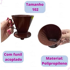 Tenha em sua cozinha este porta filtro coador de café 102, de alta qualidade, para passar um delicioso cafézinho em qualquer lugar, podendo ser guardado facilmente após o uso, possui funil acoplado, com o encaixe perfeito para sua garrafa, em peça única. Compatível com coadores do tamanho 102, sendo de papel ou de pano.