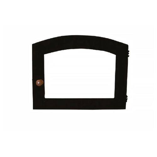 Porta em ferro fundido com acabamento em vidro e com batoque de madeira.