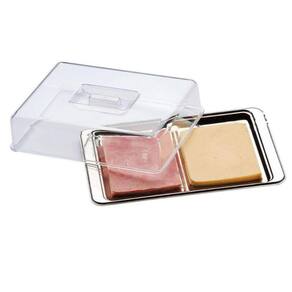 - A Cúpula de Acrílico protege os frios, ao mesmo tempo em que os deixa visíveis. - Por ser um material neutro, o Inox não altera a cor, o aroma e o sabor dos alimentos. - O conjunto para frios vem com uma bandeja de Aço Inox, durável resistente e de fácil limpeza - O produto é uma combinação perfeita de praticidade e elegância, tanto para armazenar quanto para servir