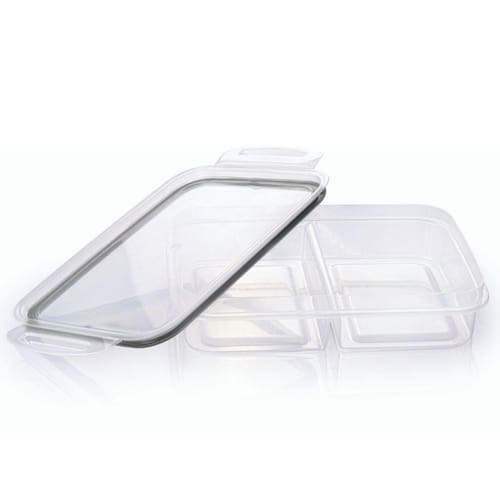 Pote plástico com 2 divisórias. Ideal para frios. Possui silicone na tampa e travas laterais para uma melhor vedação e conservação do alimento. Produzido em material atóxico, pode ser utilizado no freezer e no micro-ondas.