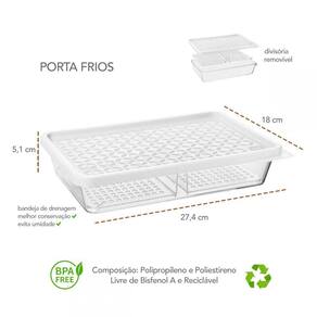 Cor: Transparente Material: Plástico e Acrílico Conteúdo da embalagem: 01 unidade Itens incluídos: 01 Porta Frios com tampa + 01 Escorredor/divisória Dimensões C x L x A : 27 x 18 x 5 cm Peso: 295g Ean: 7909875091225