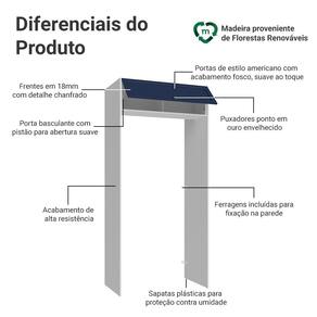 O acabamento do móvel conta com textura suave ao toque, que valoriza o visual sofisticado da linha. A combinação de branco com azul adiciona personalidade ao espaço, mantendo um visual elegante. A porta basculante com sistema de pistão a gás mantém a porta suspensa quando aberta, proporcionando mais praticidade e segurança para o uso diário.