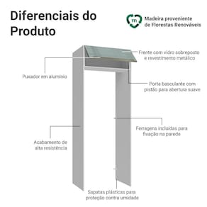 A porta basculante possui sistema de pistão a gás, que a mantém suspensa quando aberta, garantindo ainda mais segurança no dia a dia. A combinação de branco com cinza, com portas em vidro sobreposto, cria um visual moderno.
