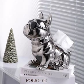 Adicione um pouco de personalidade e glamour à sua mesa com este elegante e divertido porta-guardanapo em forma de bulldog, disponível nas sofisticadas cores prata e dourado.