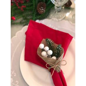 Porta Guardanapo de Natal Rústico Azevinho Branco, artesanal com Flor Permanente e Argola de Madeira Cerejeira.