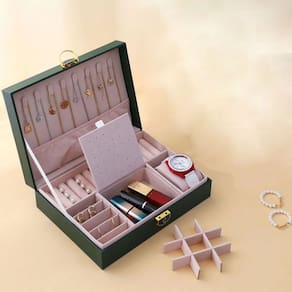 Armazenamento interno personalizável: múltiplos compartimentos separados com divisórias removíveis para acomodar joias de diferentes tamanhos e formatos.