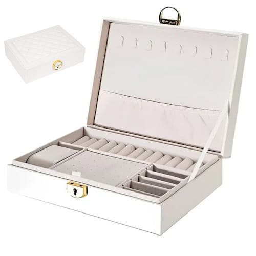 Armazenamento interno personalizável: múltiplos compartimentos separados com divisórias removíveis para acomodar joias de diferentes tamanhos e formatos.