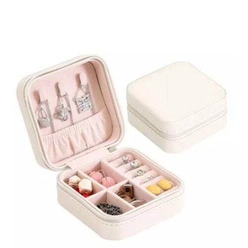 O Porta Jóias Portátil Viagem Maquiagem Estojo Couro Premium é feito de couro sintético no exterior e possui forro de lã no interior. Está disponível nas cores rosa, tiffany, branco e prata.