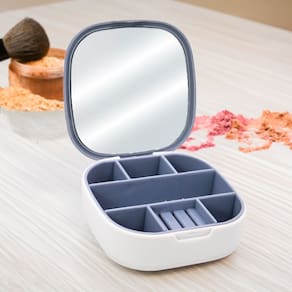 Mini Porta-Joias com Espelho Mini Porta Joia com Espelho Bijuteria Portátil Organizador Colar Anel Brinco Especificações: Dimensões: 10 x 10 x 3cm Composição: Plástico O Mini Porta-Joias com Espelho é um item prático e charmoso para guardar suas joias e acessórios de forma organizada e segura. Seu design compacto e elegante o torna perfeito para uso diário ou viagens. Confeccionado com materiais de qualidade, esse porta joias possui compartimentos internos com divisórias que permitem armazenar colares, pulseiras, anéis e brincos de maneira separada, evitando que se misturem e se danifiquem. Além disso, conta com um espelho na tampa, proporcionando a comodidade de se ver ao utilizar suas peças favoritas. A tampa do mini porta joias possui fecho seguro para garantir que seus itens estejam protegidos durante o transporte. O tamanho compacto permite que você o leve em sua bolsa ou mala facilmente, tornando-o um companheiro perfeito para qualquer ocasião. Seja para uso pessoal ou para presentear alguém especial, o Mini Porta Joias com Espelho é uma escolha encantadora e prática para guardar com carinho suas joias mais queridas. Especificações: Dimensões: 10 x 10 x 3cm de espessura. Composição: Plástico.
