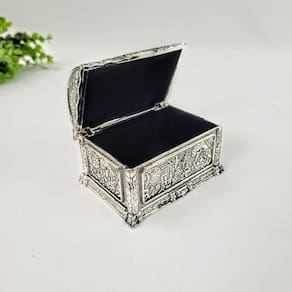 Confeccionado em metal cromado de alta qualidade na cor prata, o porta-joias apresenta desenhos orientais gravados diretamente na superfície do metal, conferindo um relevo sutil e sofisticado. Com 6 cm de altura e 8,5 cm de largura por 6,5 cm de profundidade, ele tem o tamanho ideal para ser disposto em penteadeiras, cômodas ou mesas de cabeceira.
