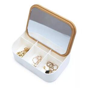 Porta Joias Organizador Retangular com Espelho e tampa de Bambu com 6 Divisórias.