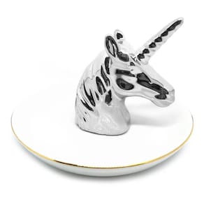 Super tendência, o Porta-Joias em Cerâmica Unicórnio Prateado era o que faltava para colocar aneis, correntes, pingentes, brincos e pulseiras na cômoda, aparador, penteadeira ou no móvel. Vai enfeitar o quarto, o closet e é um lindo presente para meninas e mulheres. Fabricado em cerâmica branca com detalhes dourados.