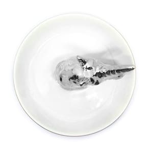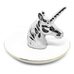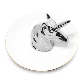 Porta Jóias - Unicórnio - Prateado Super tendência, o Porta-Joias em Cerâmica Unicórnio Prateado era o que faltava para colocar aneis, correntes, pingentes, brincos e pulseiras na cômoda, aparador, penteadeira ou no móvel. Vai enfeitar o quarto, o closet e é um lindo presente para meninas e mulheres. Fabricado em cerâmica branca com detalhes dourados.