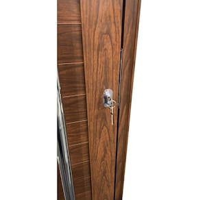 Com alumínio de alta qualidade e pintura eletrostática que simula madeira e entrega um estilo rústico e moderno. Acompanha puxador de aço inox de 80cm, friso, vidro e fechadura 3F com par de chave.