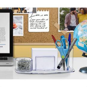 Material: poliestireno e papel Bloco de 200 folhas incluso Compartimentos: 3, suporte de caneta, suporte de papel, suporte de clipes. Cor: cristal Linha: millenium Medidas embalagem: 23,5 x 9,5 x 8 cm cxaxl Medidas do item: 7,9 x 23,2 x 9 cm Marca: acrimet Cód fornecedor: 740
