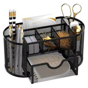 Características: - 9 Divisórias: Possui múltiplos compartimentos para acomodar lápis, canetas, marcadores, tesouras, clipes e outros acessórios de escritório. - Gaveta Frontal: Uma gaveta deslizante prática para armazenar itens menores como grampos, borrachas ou notas adesivas. - Material Durável: Confeccionado em aramado metálico preto, que oferece resistência, leveza e um toque sofisticado ao ambiente. - Design Compacto: As medidas ideais para otimizar o espaço da sua mesa - Fácil Manuseio: Com estrutura aberta que facilita a visualização e o acesso rápido aos objetos.