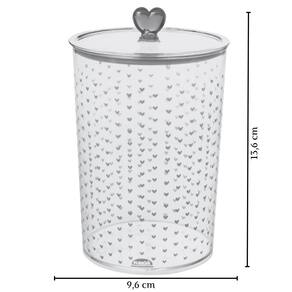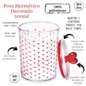 Pote Hermético 500ml redondo, transparente com decoração e tampa com puxador, com decoração predominante de corações e filete emborrachado de vedação interna na cor vermelha.