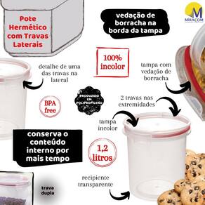 Pote plástico com capacidade para 1,2 litros. Possui silicone na tampa e travas laterais para uma melhor vedação e conservação do alimento. Produzido em material atóxico e livre de BPA. Pode ser levado ao freezer e ao micro-ondas. Diferenciais: - Modular e Empilhável: otimiza espaço em seu armário. - Tampa transparente: ótima organização em gavetas. - Vedação com borracha: vida longa aos alimentos. - Travas de fechamento: segurança ao fechar e abrir. - Livre de bisfenol-A (BPA FREE). Material: polipropileno e tampa com silicone Capacidade: 1,2 litros Comprimento: 13,6 cm / Largura: 13,1 cm / Altura: 14,2 cm Marca: Não Informado