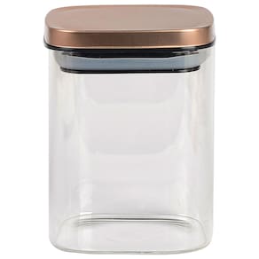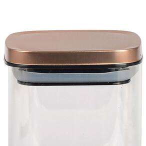 O pote é feito em vidro resistente e possui tampa de metal cobre com vedação de silicone que garante um fechamento hermético, conservando melhor os mantimentos.