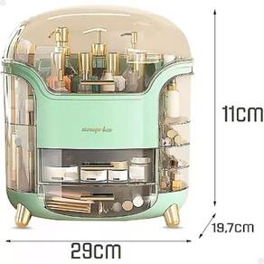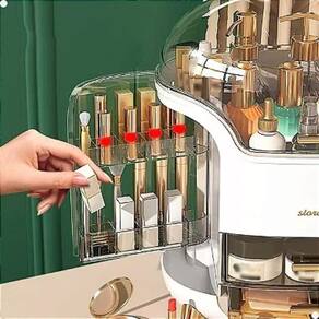 Espaçamento Inteligente: O organizador conta com compartimentos de vários tamanhos e gavetas, permitindo que você armazene tanto produtos de maior porte, como cremes e loções, quanto itens menores, como batons, pincéis e outros acessórios. A tampa superior transparente protege os produtos da poeira, garantindo que fiquem sempre limpos e acessíveis.