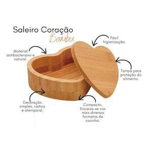 Características: cor: Natural material: Bambu Dimensões: 12x10x5cm Conteúdo: 1 saleiro em forma de Coração Compacto ocupa pouco espaço Importante: