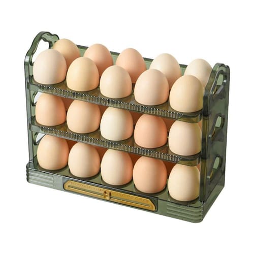 São 3 andares com espaço para 30 ovos no total, os andares se abrem para facilitar o acesso aos ovos armazenados na parte inferior.