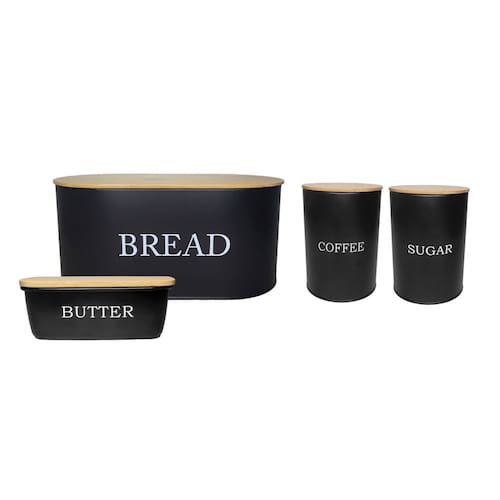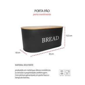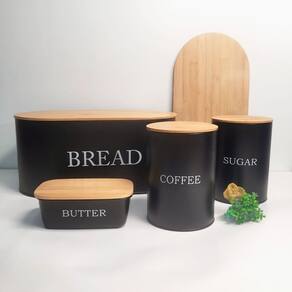 Contem: 1 Porta Pao Medidas: 34 x 18 x 15,5 cm 1 Pote de Cafe 1 Pote de Açucar Volume: 1400 ml Medidas: 15,5 x 11,5 cm 1 Porta Manteiga Volume: 500 ml Medidas: 15 x 10 x 6 cm Material: aço carbono e bambu