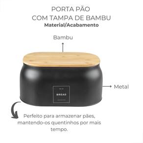 Com medidas de 33,5cm de profundidade, 23,5cm de largura e 16cm de altura, este porta pães é feito com matéria-prima de alta qualidade, combinando metal e bambu. Sua cor preta oferece um acabamento elegante e sofisticado.