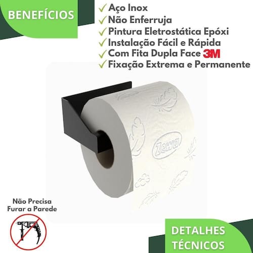 Porta Papel Higiênico Adesivo Colar Na Parede Preto DF O Porta Papel Higiênico Adesivo Dupla Face foi projetado para quem não quer furar a parede e busca por qualidade na fixação e boa aderência em ambientes molhados. Prezando pela sofisticação e elegância, cada traço do produto foi cuidadosamente desenhado para deixar seu banheiro com um visual clean e sofisticado.