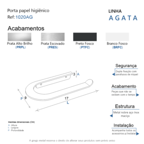 ITENS ENVIADOS: 1 porta papel higiênico, kit de parafusos e manual instrução instalação.