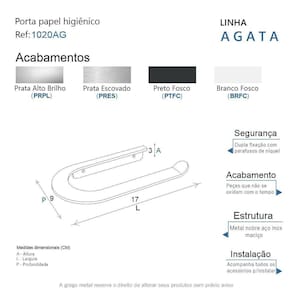O porta papel higiênico da linha Agata possui um design minimalista em linhas arredondadas, é uma peça de requinte que se destaca com luxo no seu banheiro. Além de decorar, organiza com funcionalidade o banheiro. Criado em metal nobre aço inox com uma qualidade que abrange áreas litorâneas e possui a de um acabamento muito resistente. Agora é só você adquirir este lindo acessório e fazer o seu projeto se tornar realidade com um banheiro prático para toda a sua família. Características Fabricado em metal aço inox. Disponível no Prata Alto Brilho, Escovado e Preto Fosco. Pode ser instalado em parede, azulejo e porcelanato. Benefícios Fixação prática e segura com parafusos e buchas inclusos. O produto não possui nenhum detalhe em plástico ABS . Fácil higienização, ideal para locais que exigem limpeza constante. Aproveitamento inteligente do espaço, ideal para ambientes compactos. Resistente à corrosão e luz solar. Itens ENVIADOS: 1 porta papel higiênico, kit de parafusos e manual instrução instalação. Instalação INTELIGENTE Ao 1º furo, use uma broca medida menor, após use a medida correta e finalize, vai ajudar na precisão da fixação da bucha principalmente em azulejos e porcelanato. Marca: Não Informado