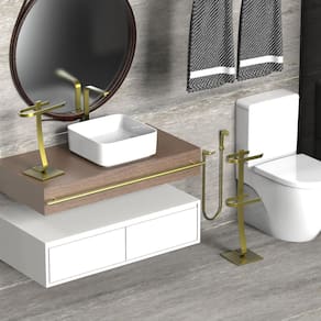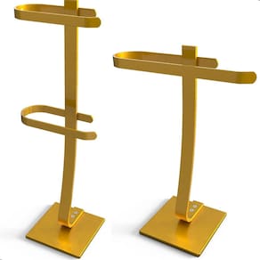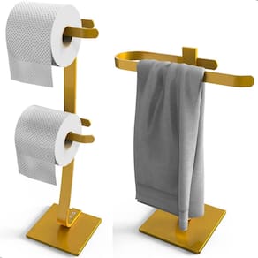 Este kit exclusivo Dourado é composto por duas peças separadas: um Porta Papel Higiênico de Chão com capacidade para 2 rolos e um Porta Toalha de Bancada para Lavabo, ambos com acabamento refinado que combina beleza, modernidade e praticidade.