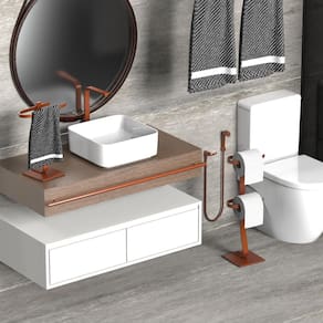 Este kit exclusivo em Rose Gold é composto por duas peças separadas: um Porta Papel Higiênico de Chão com capacidade para 2 rolos e um Porta Toalha de Bancada para Lavabo, ambos com acabamento refinado que combina beleza, modernidade e praticidade.