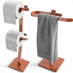 BENEFÍCIOS 2 peças independentes: flexibilidade total na disposição dos itens no ambiente. Porta toalha de bancada: prático, decorativo e sem necessidade de instalação. Porta Papel com capacidade para 2 rolos: mais conveniência e menos trocas. Acabamento Rose Gold metálico: destaque moderno e elegante. Alta durabilidade: aço resistente com pintura epóxi contra ferrugem e desgaste. Fácil limpeza e manutenção: superfície lisa que facilita a higienização.