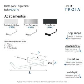 O porta papel higiênico da linha Troia possui um design atemporal, é uma peça que se destaca com imponência e modernidade. Além de decorar, organiza com funcionalidade o banheiro. Criado em metal nobre com uma qualidade que abrange áreas litorâneas e possui a de um acabamento muito resistente. Agora é só você adquirir este lindo acessório e fazer o seu projeto se tornar realidade com um banheiro prático para toda a sua família. Características Fabricado em metal alumínio. Disponível no Prata Alto Brilho, Escovado e Preto Fosco. Pode ser instalado em parede, azulejo e porcelanato. Benefícios Fixação prática e segura com parafusos e buchas inclusos. O produto não possui nenhum detalhe em plástico ABS . Fácil higienização, ideal para locais que exigem limpeza constante. Aproveitamento inteligente do espaço, ideal para ambientes compactos. Resistente à corrosão e luz solar. Itens ENVIADOS: 1 porta papel higiênico, kit de parafusos e manual instrução instalação. Instalação INTELIGENTE Ao 1º furo, use uma broca medida menor, após use a medida correta e finalize, vai ajudar na precisão da fixação da bucha principalmente em azulejos e porcelanato. Marca: Não Informado