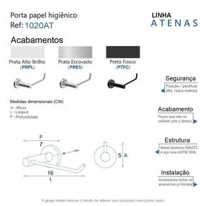 O porta papel da linha Atenas possui um design retrô, é uma peça que se destaca com luxo e elegãncia. Além de decorar, organiza com funcionalidade o banheiro. Criado em metais nobres com uma qualidade que abrange áreas litorâneas e possui a de um acabamento muito resistente. Agora é só você adquirir este lindo acessório e fazer o seu projeto se tornar realidade com um banheiro prático para toda a sua família. Características Fabricado em metal aço inox e alumínio. Disponível no Prata Alto Brilho, Escovado e Preto Fosco. Pode ser instalado em parede, azulejo e porcelanato. Benefícios Fixação prática e segura com parafusos e buchas inclusos. O produto não possui nenhum detalhe em plástico ABS . Fácil higienização, ideal para locais que exigem limpeza constante. Aproveitamento inteligente do espaço, ideal para ambientes compactos. Resistente à corrosão e luz solar. Itens ENVIADOS: 1 porta papel higiênico, kit de parafusos e manual instrução instalação. Instalação INTELIGENTE Ao 1º furo, use uma broca medida menor, após use a medida correta e finalize, vai ajudar na precisão da fixação da bucha principalmente em azulejos e porcelanato. Marca: Não Informado