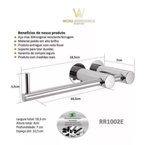 Características: Material: Aço Inox 304 (resistente à corrosão) Modelo: RR1002E Acabamento: Aço Inox 304 Polido em Alto Brilho (elegante e fácil de limpar) Instalação: Parafusado (acompanha buchas e parafusos de aço inox) Uso indicado: Banheiros, lavabos, lavatórios de uso residencial ou comercial Compatibilidade: Rolo padrão de papel higiênico