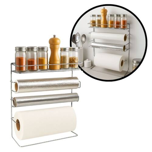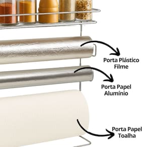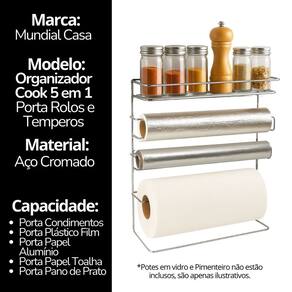 O Organizador 3 Rolos e Porta Tempero Aço Cromado 5 em 1 da Mundial Casa possui encaixe para Papel Toalha, Papel alumínio, Papel Filme, Porta Temperos ou Condimentos e ainda Porta Pano de Prato! Ele é produzido em Aço com acabamento cromado, um acessório indispensável e super funcional para sua cozinha! Basta parafusar e pronto!