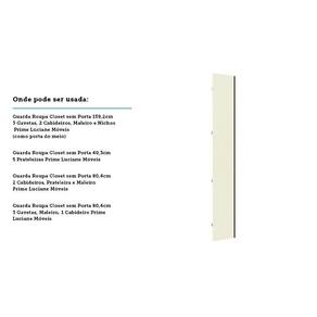 Onde pode ser utilizado: - Guarda Roupa Closet sem Porta 159,2cm 3 Gavetas, 2 Cabideiros, Maleiro e Nichos Prime Luciane Móveis - Guarda Roupa Closet sem Porta 40,3cm 5 Prateleiras Prime Luciane Móveis - Guarda Roupa Closet sem Porta 80,4cm 2 Cabideiros, Prateleira e Maleiro Prime Luciane Móveis - Guarda Roupa Closet sem Porta 80,4cm 3 Gavetas, Maleiro, 1 Cabideiro Prime Luciane Móveis