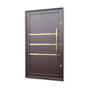Portas Pivotante de Alumínio, Linha Elite, Pintura Eletrostática Corten, 1 Folha de Abrir para o Lado Direito, Lambris Horizontais, 3 Frisos Polidos, Dourados e Envernizados, Puxador Dubai 100 Cm Polido Dourado, Altura 240 Cm, Largura 120 Cm, Requadro 11,5 Cm, Garantia de 5 anos contra defeitos de fabricação.