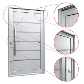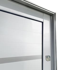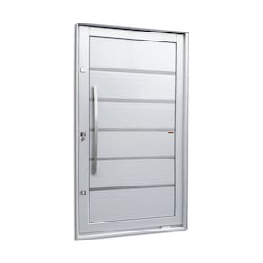 Portas Pivotante de Alumínio, Linha Elite, Pintura Eletrostática Branca, 1 Folha de Abrir para o Lado Esquerdo, Lambris Horizontais, 5 Frisos Escovados, Puxador Dubai 100 Cm Escovado, Altura 240 Cm, Largura 130 Cm, Requadro 11,5 Cm, Garantia de 5 anos contra defeitos de fabricação.