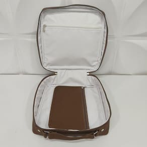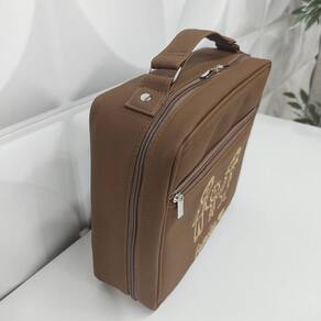 Nossa Bolsa Porta Prato é toda acolchoada. Possui um bolso frontal e um bolso interno com zíper para levar objetos. O compartimento principal possui forração interna branca e impermeável para facilitar a limpeza (limpeza sempre com pano úmido e detergente neutro – nunca utilizar produtos químicos). Cabe 6 pratos grandes com folga. Acompanha uma Bolsa porta talher para levar os talheres protegidos. Possui uma alça de mão para facilitar o transporte. Trabalhamos com material sintético de alta qualidade e durabilidade. Não hidrolisa (não descasca). Metais Niquelados.