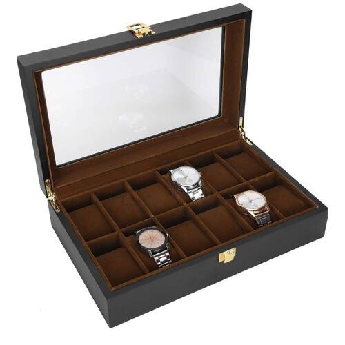 Maleta 12 Relógios em Madeira Escura Tampa Vidro/Marrom Interno CARACTERÍSTICAS DO PRODUTO: Material: madeira escura Interior: Possui almofadas e tecido aveludado Fecho: Feito em metal Tampa: Contorno em madeira com vidro no centro Medidas: Medidas do estojo: 31.5cm x 21,5cm x 8,5cm Comprimento x Largura x Altura Medidas das divisórias: 4.5cm x 9.5cm x 5.0cm Largura x Comprimento x Altura Medidas das almofadas: 4,5cm x 7,3xm x 3,5cm Largura x Comprimento x altura Marca: Ph Martins